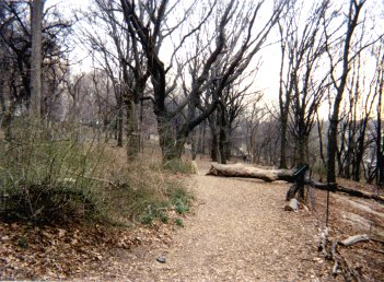 exact location, click here. Over the years, its value to birds declined as alien plant species such as Norway Maple and Mugwort migrated in, but in recent years a group of volunteers has been restoring it. Under the leadership of local naturalist Jeff Nulle, inappropriate species have been removed and replaced by bird-friendly plants like Chokeberry, Shadblow, Viburnum and Dogwood. Funding has been received from the New York City Environmental Fund and from Citarella Fine Foods. A group of volunteers from KPMG Peat Marwick has worked with Riverside Park Deputy Administrator David Bruner and Riverside Park Fund Volunteer Director Carol Bennett Gerber to plant Sumac, Witch Hazel, and other ground-covering species that birds like. A restoration plan for the sanctuary has been drawn up by Dr. Paul Kerlinger of the NY Audubon Society. Planned future improvements include the addition of soil to counter erosion, an informational sign, the installation of a drip source of water for the birds, and re-marking of the main pedestrian path through the sanctuary. During migrations up the East Coast, millions of birds fly over Manhattan every night. Come daybreak, they look down for a patch of green large enough to be a likely site for food and with enough cover to hide from predators. A remarkable number of them choose Riverside Park. The best time to see birds in the sanctuary would be a windless, sunny morning in mid-May after a night when headwinds from the north have encouraged birds to stay put. A public bird-count is held every year around Christmas time. The last one revealed 52 species, including 17 types of warblers. Highlights included an American Kestrel, a Red-breasted Nuthatch, a Scarlet Tanager and a Chestnut-sided Warbler. Common birds include Northern Mockingbirds, American Robins, Northern Cardinals, Wood Thrushes, Brown Thrashers, American Crows, Northern Flickers, and Red-bellied Woodpeckers. Peregrine Falcons nest in the nearby tower of Riverside Church.Other animals seen in the sanctuary include racoons, cottontail rabbits, chipmunks, woodchucks, opposums, and a coyote (!) The coyote was adopted by several police officers, who fed it chicken parts and named it "Izzy." And when the fields east and north of the 119th St. tennis courts are at their optimal height, they are one of the best butterfly gardens in New York City, with Monarchs, Red Admirals, Painted Ladies, Cabbage Whites, Clouded Sulphurs, Question Marks, Tiger Swallowtails, Black Swallowtails and others. For more information about the sanctuary, call 870-3070. The photograph below was taken in March of 1999 and shows the cleared pedestrian trail.