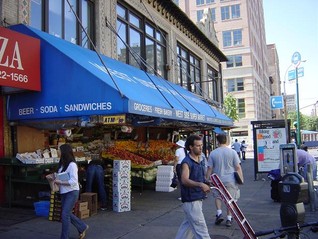 Retail establishments like this one use sidewalk space that does not belong to them to increase their selling area. This should not be allowed in a crowded spot like this, which has a newsstand, a bus stop, and a subway entrance in close proximity, not to mention the active loading dock of the supermarket.
